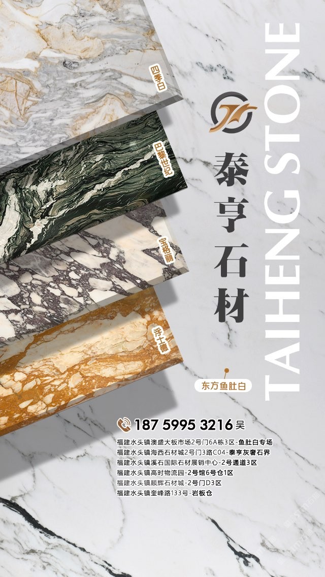 泉州泰亨石材有限公司,辦公地點位于中國石材之都—南安水頭。經(jīng)營產(chǎn)品有:東方魚肚白(自有礦山),四季白,巴黎世紀,寶格麗,浮士德,布達拉灰(自有礦山),星空灰(自有礦山)、雅蘭云天(包礦)、蘋果灰(包礦)、銀鉆咖啡(包礦)、魚肚白、雪花白、藍金沙白金沙系列、帕斯高灰、意大利木紋、意大利,西班牙原裝進口巖板(中國總代理)、國產(chǎn)巖板(福建總代理)、黃斑石、意大利木紋、銀鉆咖啡,魚肚灰等優(yōu)質品種。我們以經(jīng)驗豐富的采購團隊,熱情專業(yè)的銷售團隊和執(zhí)著細致的技術團隊,為客戶提供精致的產(chǎn)品,售前售后服務和技術支持。本著為客戶負責的態(tài)度,經(jīng)過多年的潛心經(jīng)營,泰亨石材在石材業(yè)界樹立了良好的信譽。如果您對我司的產(chǎn)品服務有興趣,歡迎在線留言或來電來函咨詢,泰亨石材在追求美的路上與您一路同行。