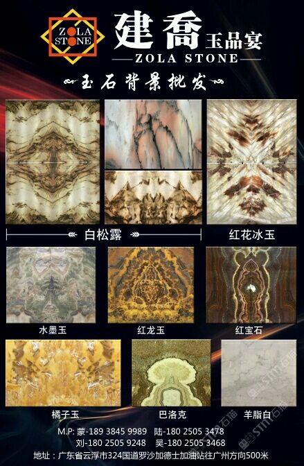 本公司有現(xiàn)貨各類精品高檔玉石背景墻。圖案精美,品種多樣,各種大小尺寸拼圖,板材足足1.8厚。歡迎來電咨詢!