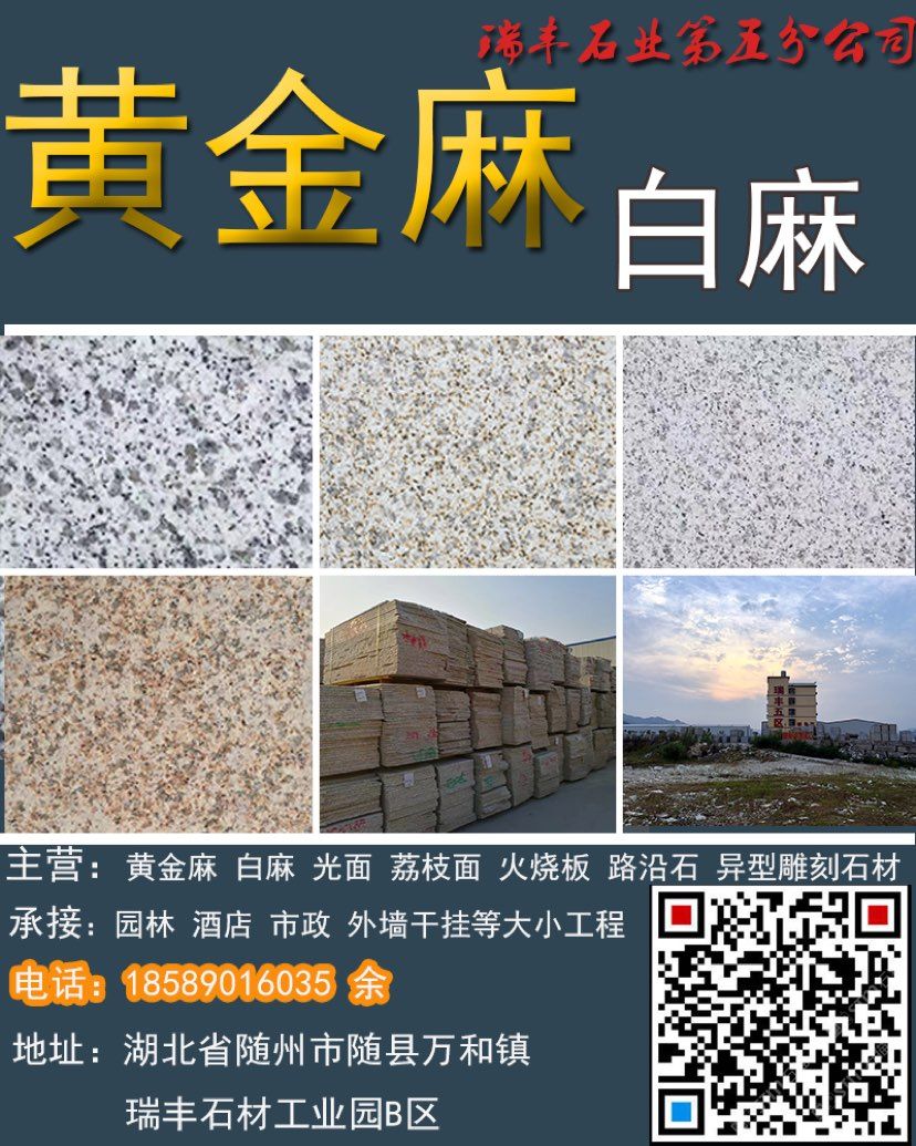 礦廠直銷;黃金麻,白麻,路沿石,蘑菇石,火燒面,光面,荔枝面,機(jī)切面,自然面,異形加工等各種規(guī)格板材。承接園林,廣場(chǎng)外墻干掛等各種工程應(yīng)用板材。規(guī)格齊全,保質(zhì)保量,歡迎新老客戶來電下單。18589016035