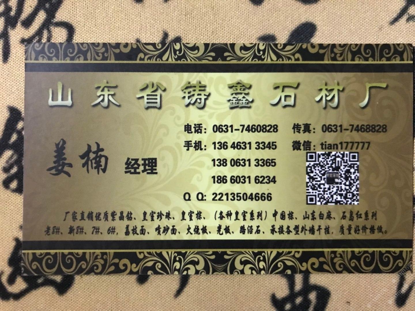 中國山東威海您好我是山東省榮成市石島紅產(chǎn)地鑄鑫石材有限公司公司成立于1992年主要經(jīng)營:石島紅老8#新8#7#6#皇室系列紫晶鉆白麻榮成灰等優(yōu)質產(chǎn)品,A級荒料火燒板光板荔枝面復古