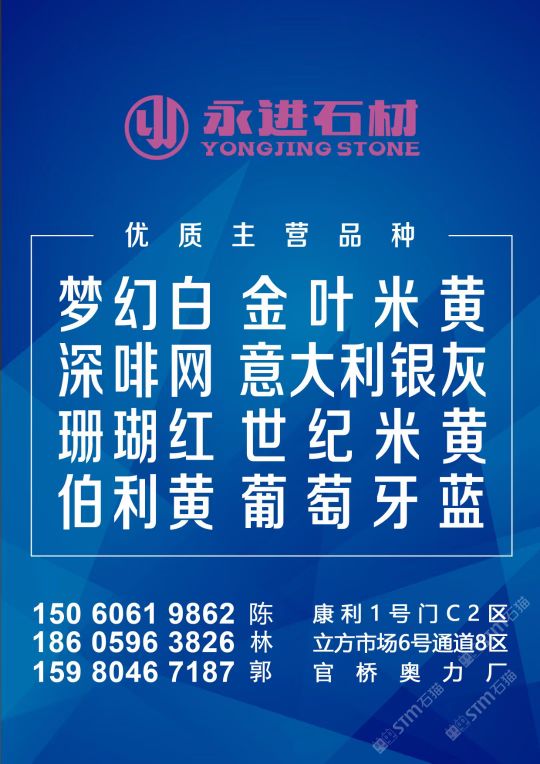 永進石材主營:魚肚灰,夢幻白,土耳其愛馬仕灰,意大利銀灰,金葉米黃、深啡網(wǎng)、世紀米黃、珊瑚紅、伯利黃、葡萄牙藍;