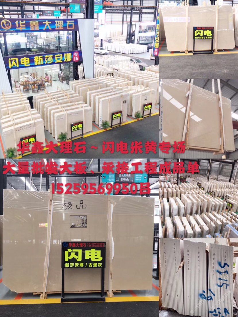 華鑫大理石:主營:閃電米黃(新莎安娜)、胖子灰(云朵拉灰)、古堡灰、法國流金,荒料、大板,長期現(xiàn)貨70000平方,荒料8000噸\