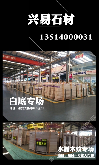 發(fā)布信息: ? ? ? 【興易大理石】 ? ? 白底水晶木紋專場 ? 我司主營水晶木紋系列產(chǎn)品: 水晶木紋,翡翠木紋,國產(chǎn)藍(lán)金沙,白金沙,彩虹木紋 ? 三萬平白底水晶木紋直紋新料任選, 條板,大板 荒料均有售,統(tǒng)一花色,防水背膠供應(yīng)! 一片起售,白底特價(jià)板88起 我們專做!專注! 歡迎工程單合作 ? ?地址: ? 濱海高時(shí)物流一號(hào)館大門旁 ? 創(chuàng)安c區(qū)c7區(qū)興易石材 ? 電話:13514000031小李 ? ?