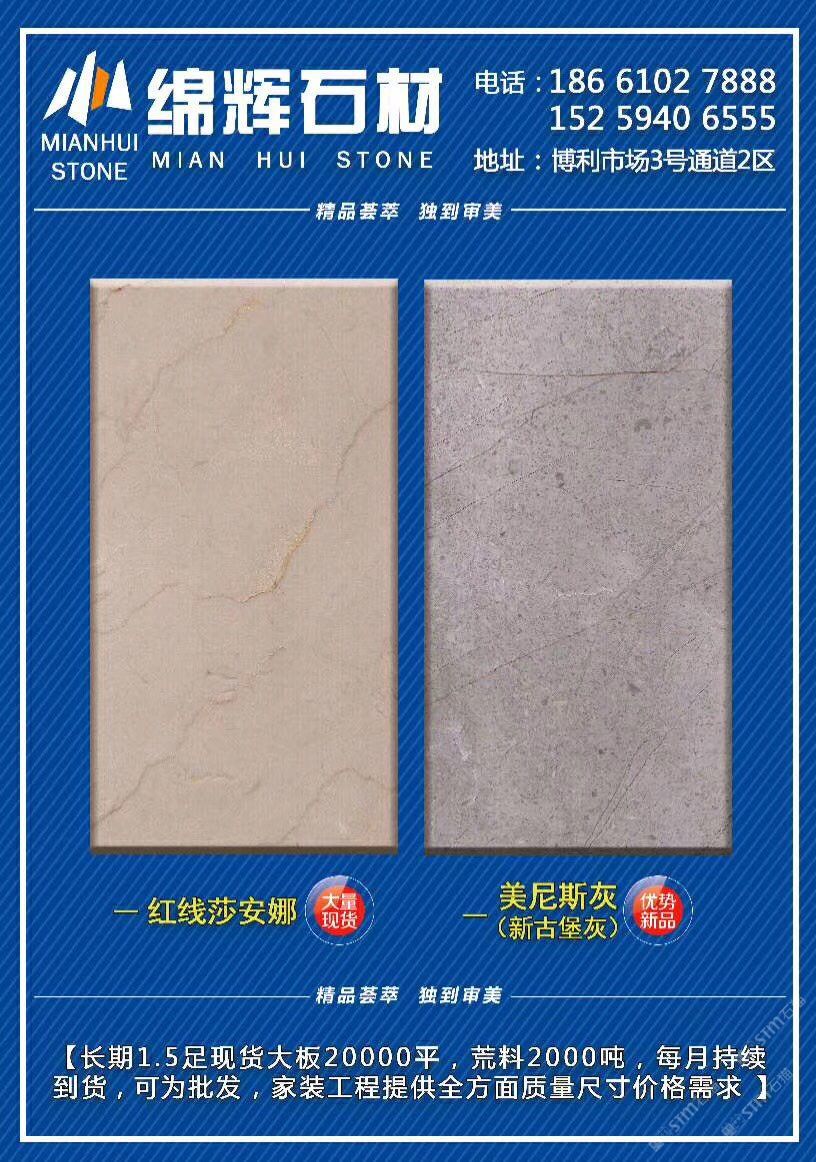 發(fā)布信息: 主營:《紅線莎安娜》《美尼斯灰·新古堡灰》 ??長期現(xiàn)貨兩萬平走量不走價,超值特惠90元起?? [發(fā)]另有3500平《金歐典》品種清倉揮淚甩賣[發(fā)] 地址:福山工業(yè)區(qū)博利大板市場3通道2區(qū) 致富熱線:13004819222李