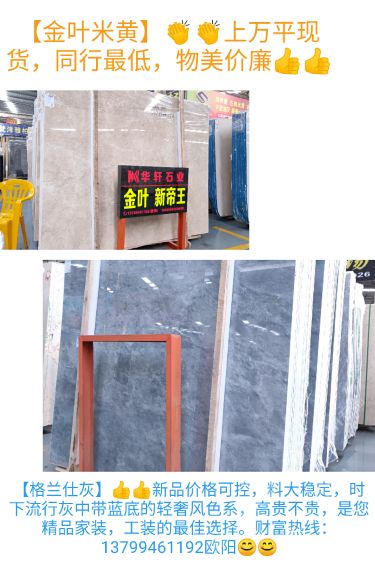 發(fā)布信息: 金葉米黃.新帝 格蘭仕灰 價廉,物美 大量新貨.工程.家裝 銷售熱線:13799461192歐陽 地址:澳盛5B棟1區(qū)【華軒石業(yè)】