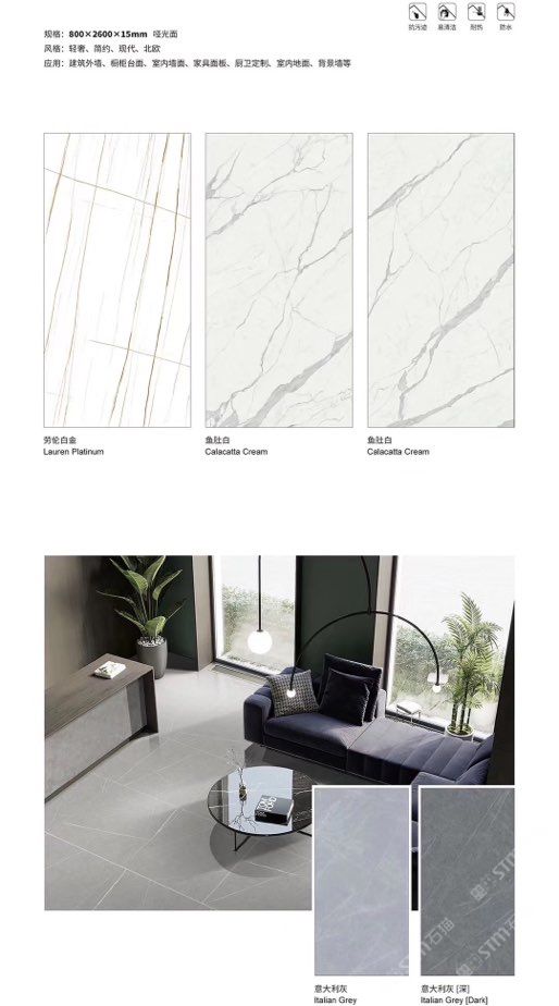 發(fā)布信息: ????SIBELAN 斯貝納巖板???? ????意大利設(shè)計(jì)師精選巖板???? 我們可以幫老總您加工為成品, 全國范圍內(nèi)可安排專業(yè)團(tuán)隊(duì)安裝. 做到您一次性采購 省心. 放心. 省時(shí). 低價(jià)! 巖板紋路版面全多達(dá)199 款 勵(lì)志做服務(wù)五星的巖板專業(yè)供應(yīng)商 魚肚白 雪花白 格蘭云天 寒江雪 爵士白 幻影灰 勞倫黑金 火山灰 亞馬遜 艾維拉 羅馬黑檀 貝特巖 細(xì)花白 羅馬灰 云朵拉灰 魚肚金 莎羅娜 莎羅蘭 勞倫白金 拉薩白 中花白 灰冰玉 卡拉拉白 撒金黑 清水玉 薩瓦灰 莎士比亞 大花灰 白冰玉 銀灰洞 阿瑪尼灰 綠紋玉 綠冰玉 藍(lán)紋玉 保加利亞灰 鐵銹 黑木紋 流砂灰 純白 純灰 純黑 TEL: 15905069590 聶 各種版面規(guī)格全部如下: 1200×600×11mm 啞光 1500×800×11mm 啞光 1800×900×11mm 啞光 1800×900×12mm 啞光 2600×800×15mm 啞光 2400×1200×6mm 啞光/亮光 2400×1200×9mm 啞光/亮光 2400×1200×15mm 啞光 2700×1200×6mm 啞光/亮光 2700×1600×12mm 啞光/亮光 3200×1600×6mm 啞光/亮光 3200×1600×12mm 啞光/亮光
