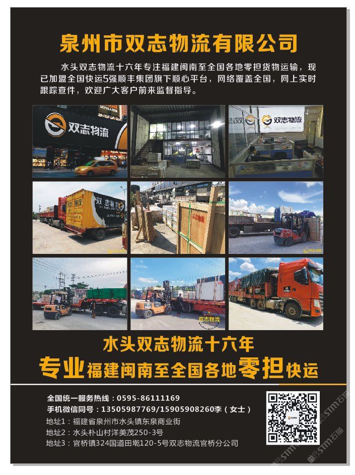 發(fā)布信息: ??【雙志物流】成立于2004年專業(yè)福建閩南至全國(guó)石材、瓷磚、巖板、背景墻、機(jī)械設(shè)備等零擔(dān)往返快運(yùn)倉(cāng)儲(chǔ)配送貨物運(yùn)輸!大泉州地區(qū)同城一日達(dá)物流運(yùn)輸,水頭、官橋、晉江三個(gè)倉(cāng)儲(chǔ)中心打造大泉州同城智慧物流。歡迎廣大客戶監(jiān)督指導(dǎo)合作共享! 零擔(dān)天天發(fā)車,隨時(shí)可提貨!?????? 歡迎新老朋友來(lái)電咨詢 手機(jī)微信同號(hào)? 整車熱線:15905908260 零擔(dān)熱線:18314695339