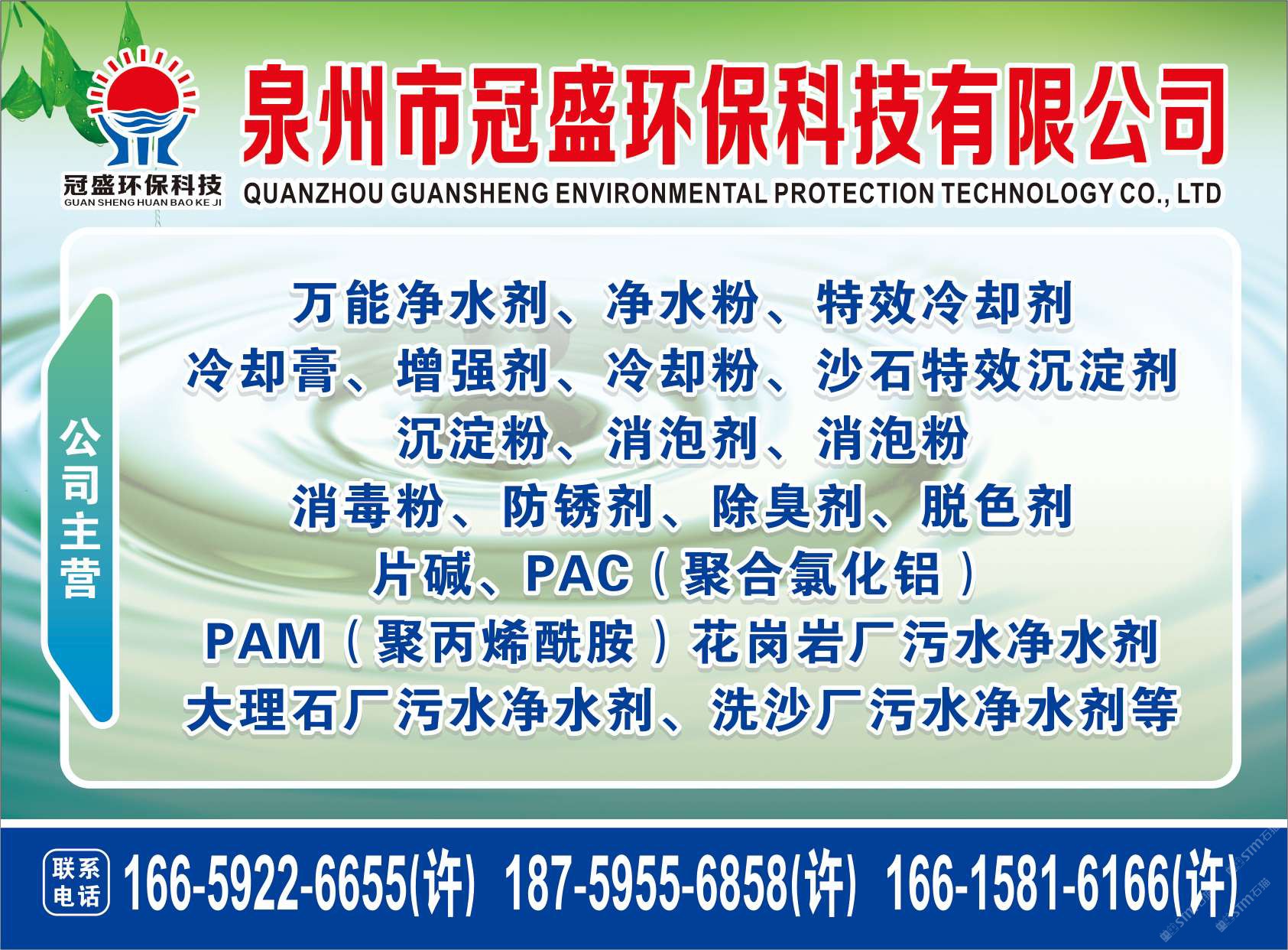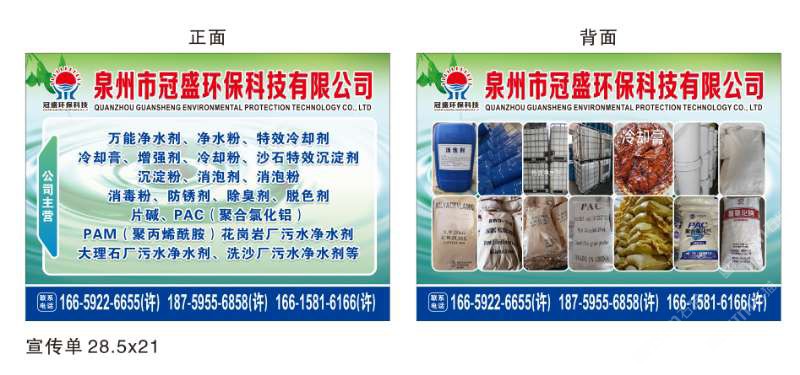 發(fā)布信息: 冠盛環(huán)保科技16659226655 主營產(chǎn)品:凈水劑,冷卻劑,冷卻粉,大理石人造石專用凈水劑,沉淀粉,消泡劑,消毒凈水劑,防銹凈水劑,除銹劑,除臭劑,聚丙烯酰胺,聚合氯化鋁,鹵精,洗沙專用凈水劑,壓濾機(jī)專用凈水劑,陶瓷廠專用凈水劑(黃藥 白藥)等所有水處理環(huán)保材料……