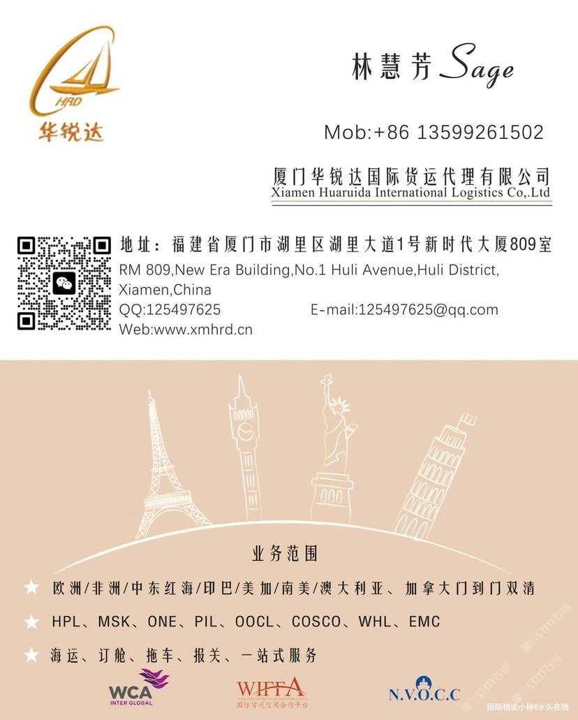 廈門華銳達(dá)國際物流有限公司 聯(lián)系人:林慧芳    135****1502 查看 135****1502 查看 主營范圍: 物流、 企業(yè)地址:福建廈門廈門湖里區(qū)湖里大道1號新時代大廈8樓809室