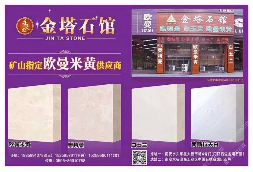 金塔石業(yè) 聯(lián)系人:呂先生    188****0788 查看 手機(jī)號(hào)碼:無 主營(yíng)范圍: 大板批發(fā)、荒料、大理石加工、石材外貿(mào)、 企業(yè)地址:福建南安水頭鎮(zhèn)東星大板市場(chǎng)5號(hào)門A(3a)